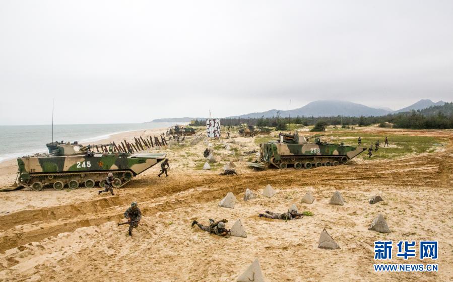 陸軍第72集團軍某旅組織海上駕駛訓練,戰車按協同隊形依次駛上海軍登陸艦(2018年8月16日攝,無人機照片)。新華社發(莊林毅 攝)