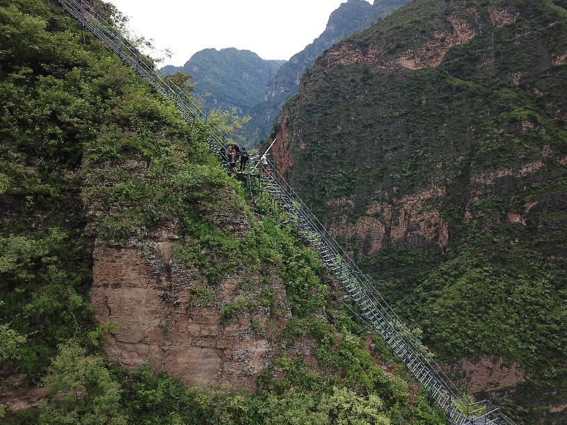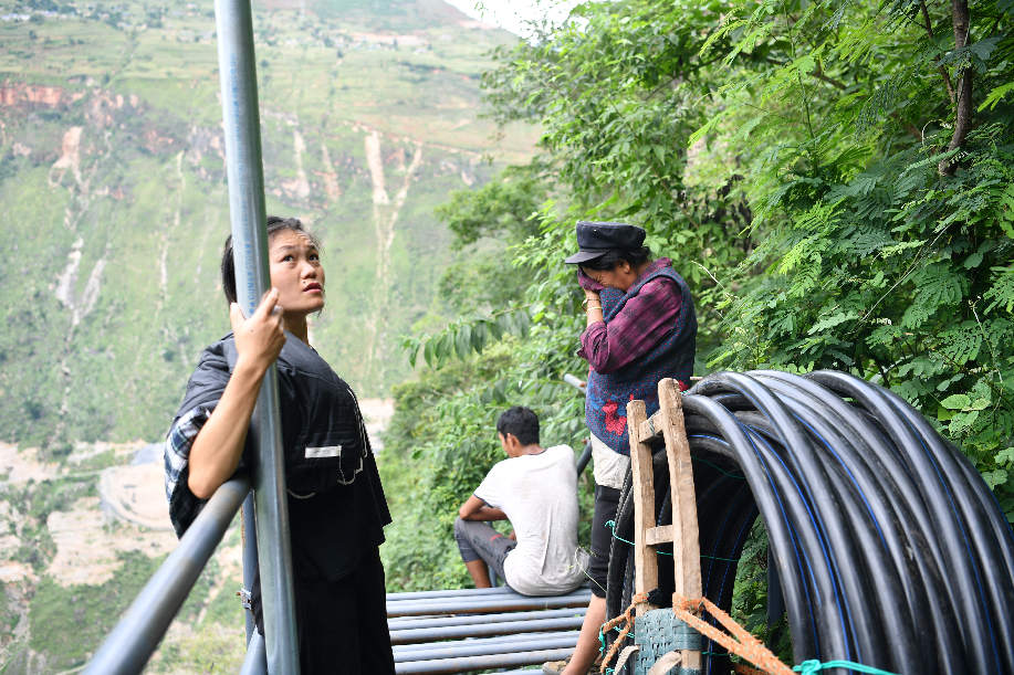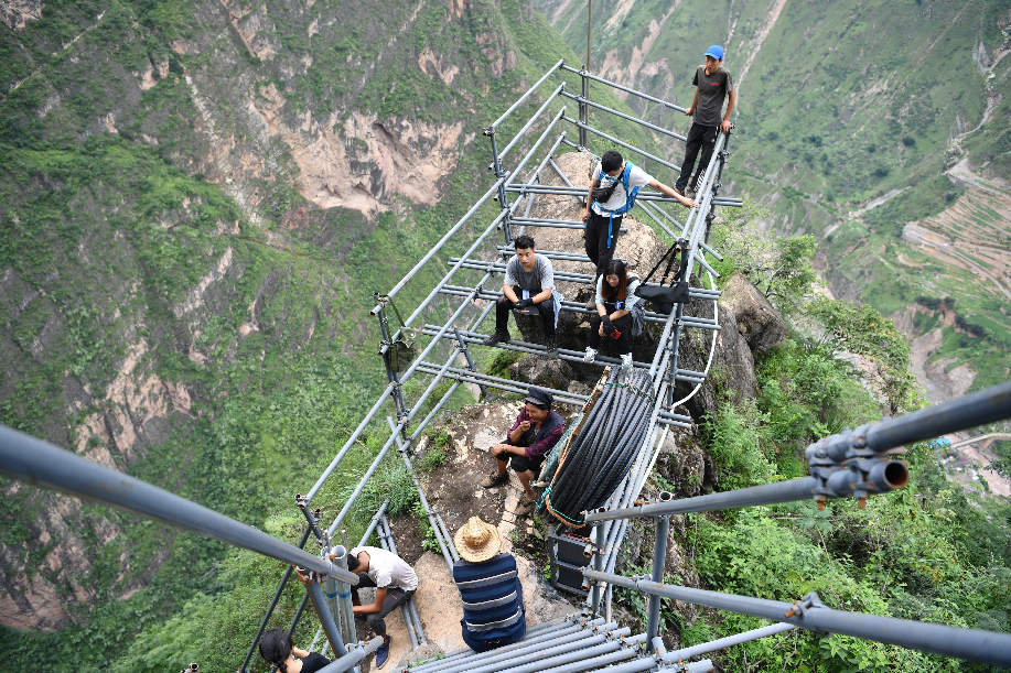 ????2017年9月初,四川涼山“懸崖村”村民背貨物通過天梯上山,中途休息。四川省涼山州昭覺縣支爾莫鄉阿土列爾村,坐落于海拔約1600米的山坳中,從山底到山頂村莊海拔高差近1000米,村民往返村子都需要借助懸崖峭壁間的天梯,從而被稱為“懸崖村”。為緩解村民出行險的問題,當地投入120噸鋼材、共6000根鋼管修筑了2556級“鋼管天梯”,工程于2017年6月底徹底完工,如今,“鋼管天梯”已經取代了之前更危險的藤梯,成為村民通往外界唯一的道路。 張浪 攝