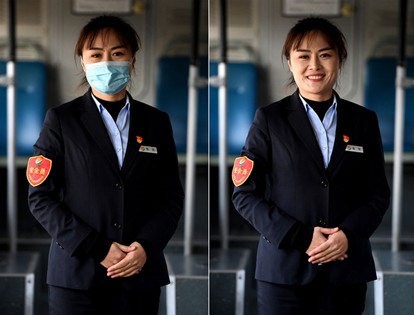 這是12月18日拍攝的鄭州公交二公司B38路公交車(chē)車(chē)長(zhǎng)黃菲肖像(拼版照片)。