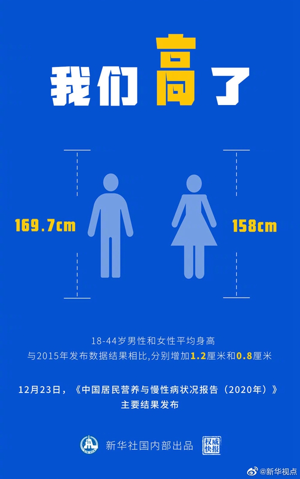 你的營養(yǎng)和健康情況怎樣?高了?身體倍棒?12月23日,一份關(guān)乎你我的健康大數(shù)據(jù)重磅上新,《中國居民營養(yǎng)與慢性病狀況報(bào)告(2020年)》主要結(jié)果發(fā)布——成人平均身高繼續(xù)增長,營養(yǎng)不足問題得到改善,健康意識(shí)逐步增強(qiáng)。(記者:陳聰,海報(bào)設(shè)計(jì):張晨光) ????