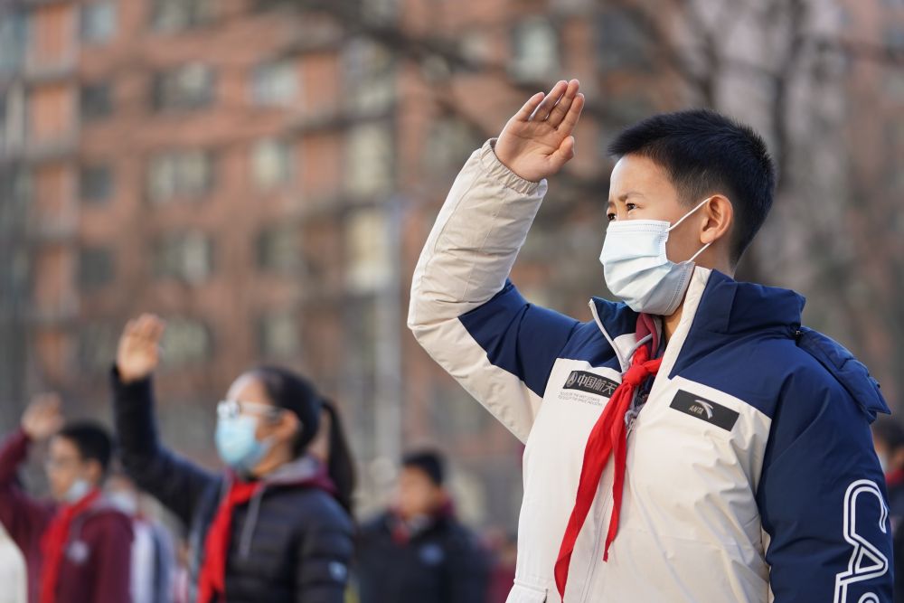 ??12月21日,在北京四中廣外校區(qū),蔡昊霖(前)和同學一起參加升旗儀式。