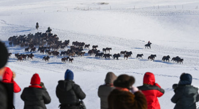 游客在昭蘇縣天馬旅游文化園拍攝“萬馬奔騰“(12月20日攝)。新華社記者 丁磊 攝