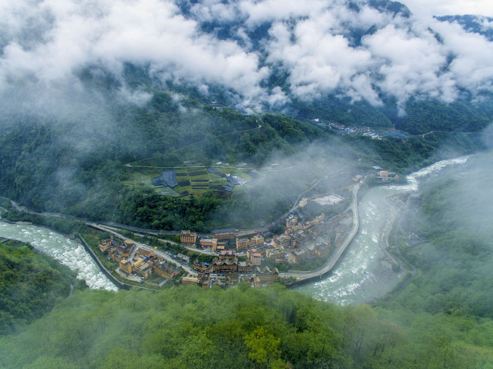 云霧繚繞的云南貢山獨龍族怒族自治縣獨龍江鄉(2019年4月16日無人機拍攝)。新華社記者 江文耀 攝