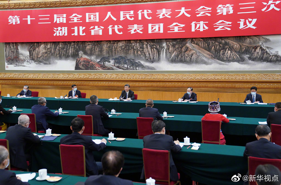 24日下午,中共中央總書記、國家主席、中央軍委主席習近平參加十三屆全國人大三次會議湖北代表團審議。(記者張曉松、朱基釵、李學仁、黃敬文)