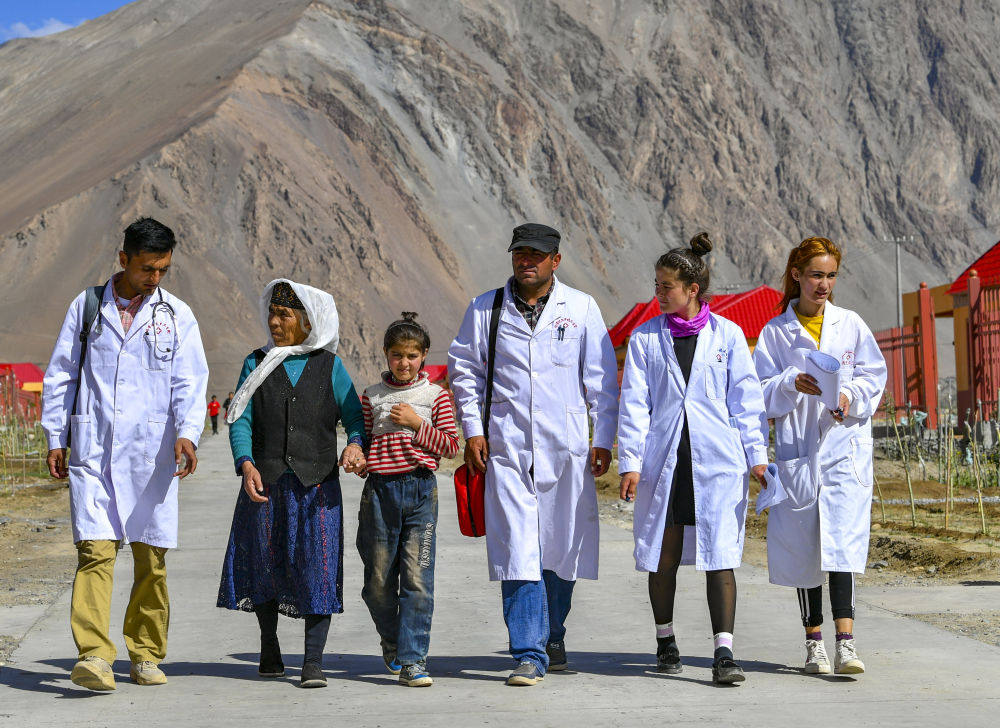 新疆塔什庫爾干塔吉克自治縣達布達爾鄉熱斯喀木村村醫發爾亞特·塔西白克(右三)與醫務人員來到當地易地扶貧搬遷安置點出診(2019年7月7日攝)。新華社記者 胡虎虎 攝