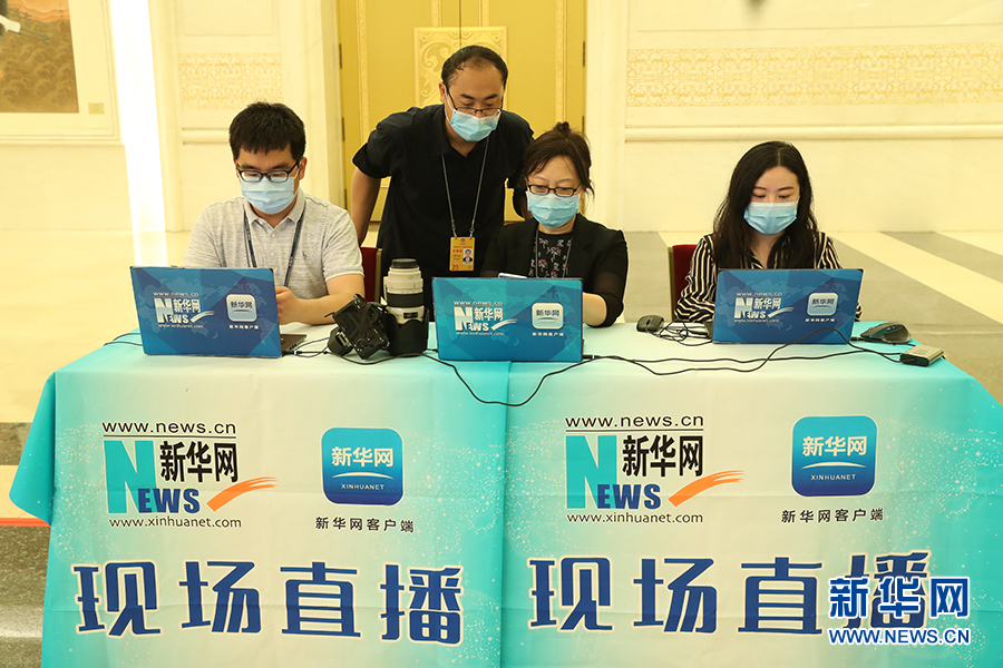 2020年5月28日下午十三屆全國人大三次會議閉幕后,國務院總理李克強在人民大會堂三樓金色大廳出席記者會并回答中外記者提問。為有效防控疫情,共同維護公共衛生與健康,記者會采用網絡視頻形式進行。圖為新華網現場直播團隊。 新華網 王翰林 攝