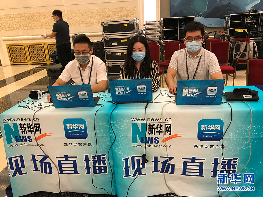 ??? 2020年5月28日下午十三屆全國(guó)人大三次會(huì)議閉幕后,國(guó)務(wù)院總理李克強(qiáng)在人民大會(huì)堂三樓金色大廳出席記者會(huì)并回答中外記者提問(wèn)。為有效防控疫情,共同維護(hù)公共衛(wèi)生與健康,記者會(huì)采用網(wǎng)絡(luò)視頻形式進(jìn)行。圖為新華網(wǎng)現(xiàn)場(chǎng)直播團(tuán)隊(duì)。 新華網(wǎng) 王翰林 攝