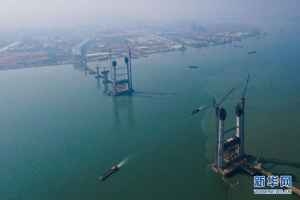 2021年2月2日,深中通道橫門大橋兩端的非通航孔橋將使用60米混凝土箱梁(無人機照片)。當日,深中通道項目首榀60米混凝土箱梁在位于中山市馬鞍島的中鐵大橋局深中通道項目智慧梁場澆筑成功。新華社記者 劉大偉 攝