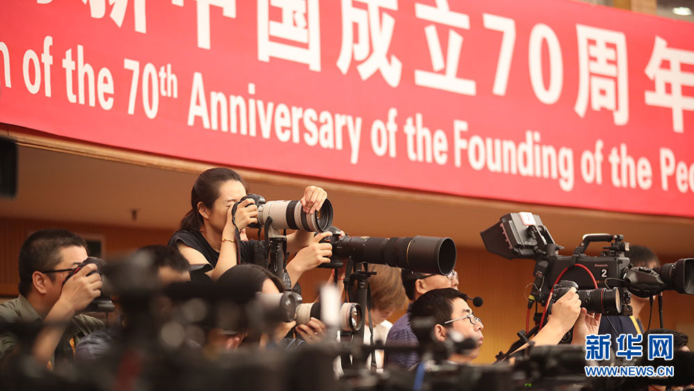 9月24日,慶祝中華人民共和國成立70周年活動(dòng)新聞中心在北京梅地亞中心二層新聞發(fā)布廳舉辦第一場(chǎng)新聞發(fā)布會(huì)。圖為采訪新聞發(fā)布會(huì)的媒體記者。新華網(wǎng)記者 陳競(jìng)超 攝
