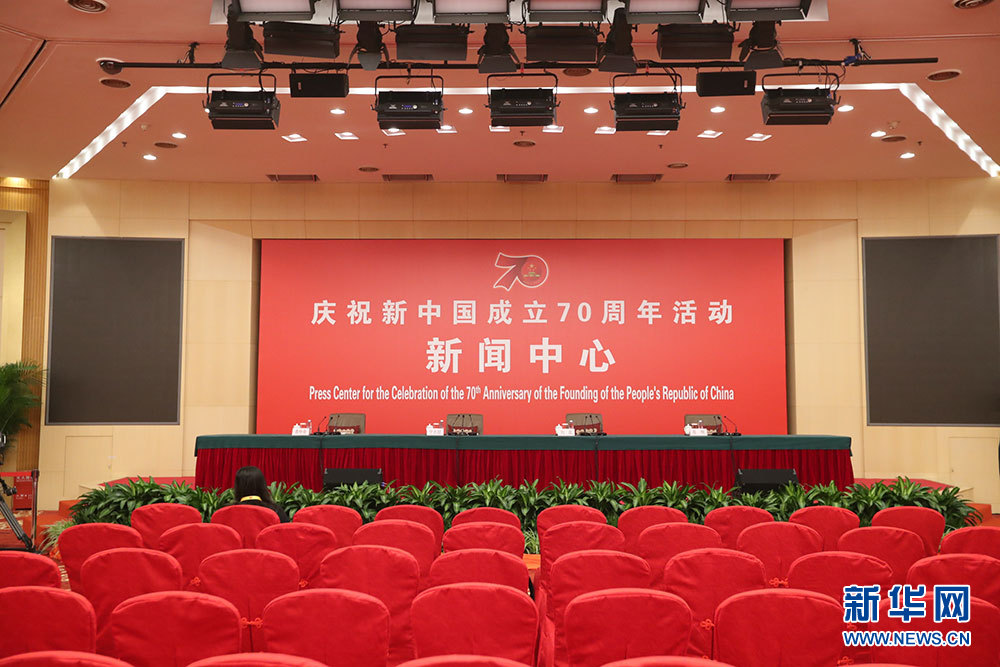 9月24日,慶祝中華人民共和國(guó)成立70周年活動(dòng)新聞中心在北京梅地亞中心二層新聞發(fā)布廳舉辦第一場(chǎng)新聞發(fā)布會(huì)。圖為新聞發(fā)布會(huì)開(kāi)始前的現(xiàn)場(chǎng) 。新華網(wǎng)記者 陳競(jìng)超 攝?