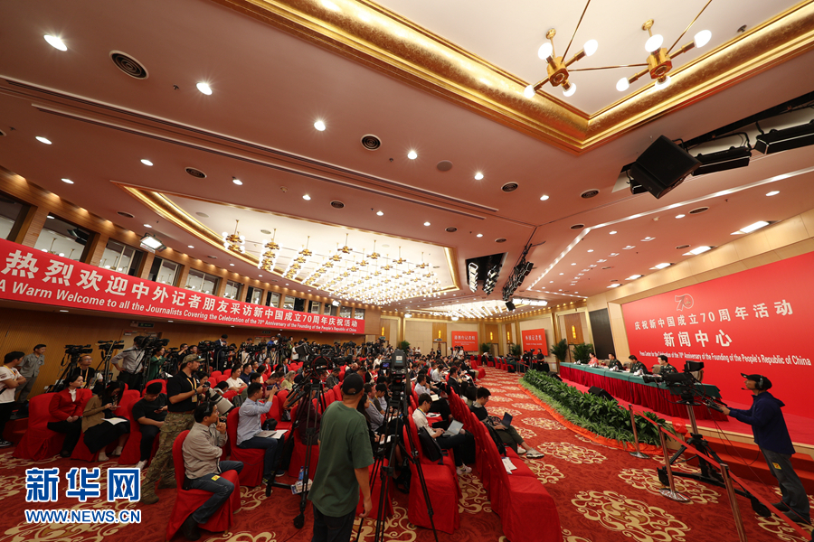 9月24日,慶祝中華人民共和國成立70周年活動新聞中心在北京梅地亞中心二層新聞發(fā)布廳舉辦第一場專題集體采訪。圖為新聞發(fā)布會現(xiàn)場。新華網(wǎng)記者 郭小天 攝