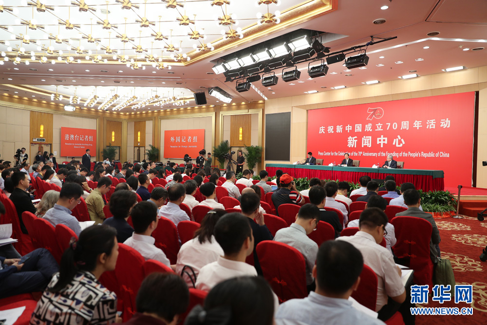 9月27日,慶祝中華人民共和國成立70周年活動新聞中心在梅地亞中心二層新聞發(fā)布廳舉辦第三場新聞發(fā)布會,中央農(nóng)村工作領(lǐng)導(dǎo)小組辦公室主任、農(nóng)業(yè)農(nóng)村部部長韓長賦,國務(wù)院扶貧開發(fā)領(lǐng)導(dǎo)小組辦公室主任劉永富介紹全面建成小康社會,扎實推進(jìn)脫貧攻堅和鄉(xiāng)村振興,并回答記者提問。圖為發(fā)布會現(xiàn)場。新華網(wǎng) 陳杰 攝