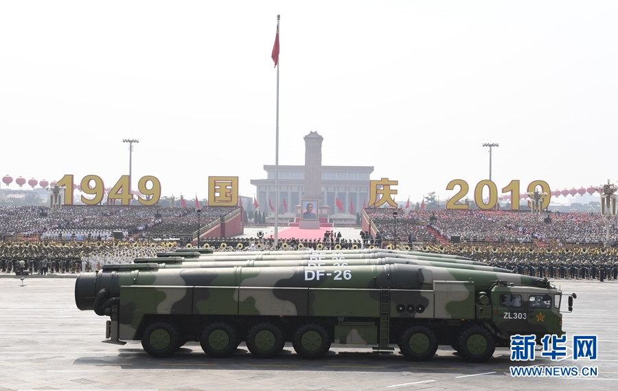 10月1日上午,慶祝中華人民共和國成立70周年大會在北京天安門廣場隆重舉行。這是東風-26核常兼?zhèn)鋵椃疥牻邮軝z閱。 新華社記者 高潔 攝