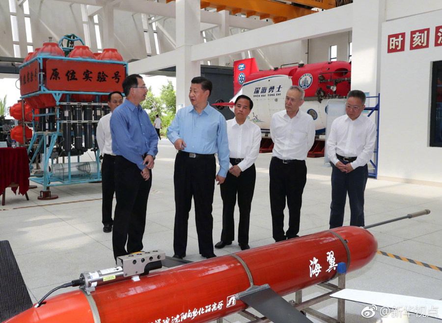 新華網北京4月12日電 12日下午,習近平總書記來到位于海南三亞的中國科學院深海科學與工程研究所,仔細察看“海翼”號深海滑翔機、“天涯”深淵著陸器等設備,并同“深海勇士”號載人潛水器設計師和深潛團隊親切交談。(據新華社“新華視點”微博報道,記者張曉松,攝影李學仁、謝環馳)