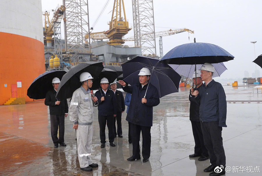 6月13日下午,習(xí)近平冒雨來到中集來福士海洋工程有限公司煙臺(tái)基地?!八{(lán)鯨1號(hào)”鉆井平臺(tái)巍峨佇立、“泰山”龍門吊高聳入云,習(xí)近平撐著傘邊走邊看,詳細(xì)了解企業(yè)走自主創(chuàng)新發(fā)展之路、開展高端海洋工程設(shè)備自主設(shè)計(jì)研發(fā)制造情況。聽說“藍(lán)鯨1號(hào)”去年創(chuàng)造了可燃冰開采時(shí)間和產(chǎn)量?jī)身?xiàng)世界紀(jì)錄,習(xí)近平鼓勵(lì)他們繼續(xù)努力??倳浲F(xiàn)場(chǎng)的工人們一一握手,他說,基礎(chǔ)的、核心的東西是討不來買不來的,要靠我們自力更生、自主創(chuàng)新來實(shí)現(xiàn)。我看你們有這個(gè)信心,希望你們迎難而上、再接再厲。(記者張曉松、謝環(huán)馳)