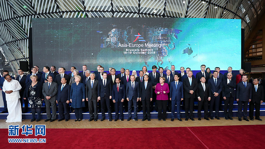 當地時間10月19日上午,國務院總理李克強在布魯塞爾出席第十二屆亞歐首腦會議。這是與會領導人合影。 新華社記者 丁海濤 攝