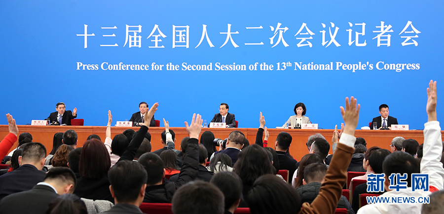 3月15日,國務院總理李克強在北京人民大會堂會見采訪十三屆全國人大二次會議的中外記者并答記者問。這是記者舉手提問。 新華社記者 殷剛 攝