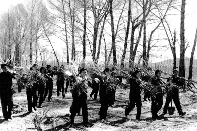 20世紀(jì)六七十年代,右玉縣群眾在荒山植樹(shù)(翻拍照片)。新華社發(fā)