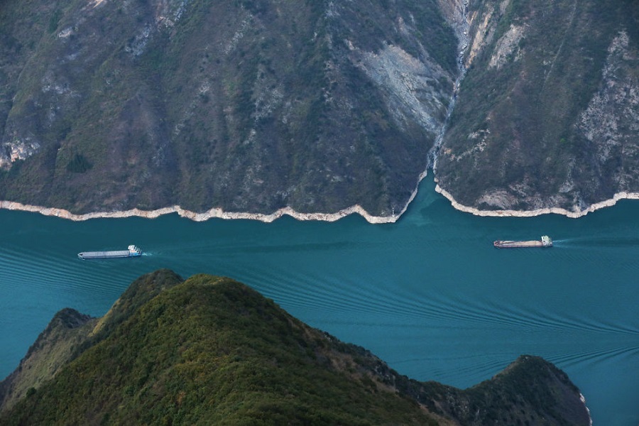 貨輪行駛在重慶巫山縣境內(nèi)的長江巫峽段江面上。