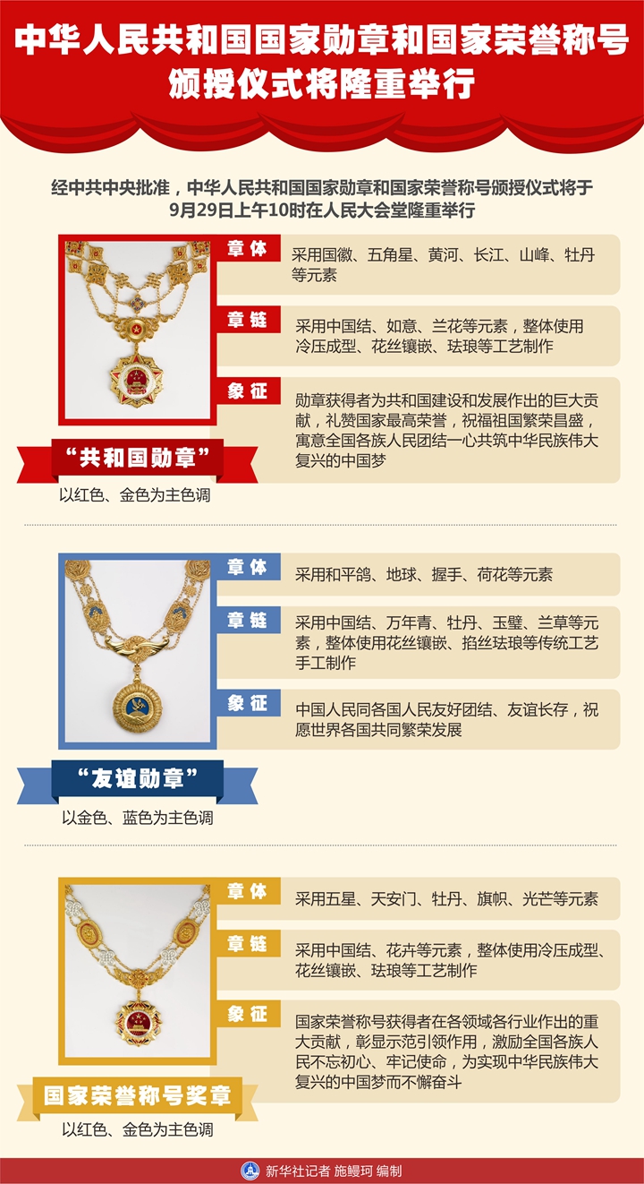 經(jīng)中共中央批準,中華人民共和國國家勛章和國家榮譽稱號頒授儀式將于9月29日上午10時在北京人民大會堂隆重舉行。 這是“友誼勛章”。 新華社發(fā)