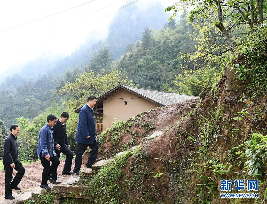 2019年4月15日,在重慶石柱土家族自治縣中益鄉(xiāng)華溪村,習(xí)近平踏著濕滑的石階登上陡坡,前往貧困戶譚登周家看望。新華社記者 謝環(huán)馳 攝