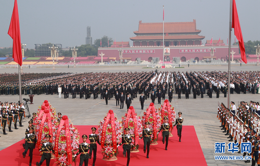 紀念碑前,4000多名各界代表手持鮮花,列隊肅立。他們中有年逾九旬的老戰士、老同志,有胸前佩戴著紅飄帶的烈士親屬,有國家勛章和國家榮譽稱號獲得者代表,有參加全國民族團結進步表彰大會的代表,有朝氣蓬勃的青年學生和少年兒童。