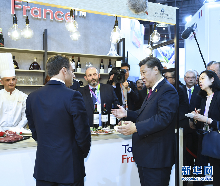 習(xí)近平在法國(guó)總統(tǒng)馬克龍陪同下首先來(lái)到法國(guó)館。馬克龍熱情邀請(qǐng)習(xí)近平品嘗法國(guó)紅酒和牛肉食品。在場(chǎng)法國(guó)企業(yè)家爭(zhēng)先恐后向習(xí)近平表示,法國(guó)企業(yè)看好中國(guó)市場(chǎng),希望進(jìn)一步擴(kuò)大對(duì)華出口。習(xí)近平指出,中國(guó)消費(fèi)市場(chǎng)很大,可以滿足不同層次的多樣化需求,希望法國(guó)企業(yè)家展現(xiàn)長(zhǎng)遠(yuǎn)眼光,同中國(guó)加強(qiáng)互利合作。