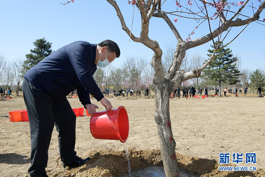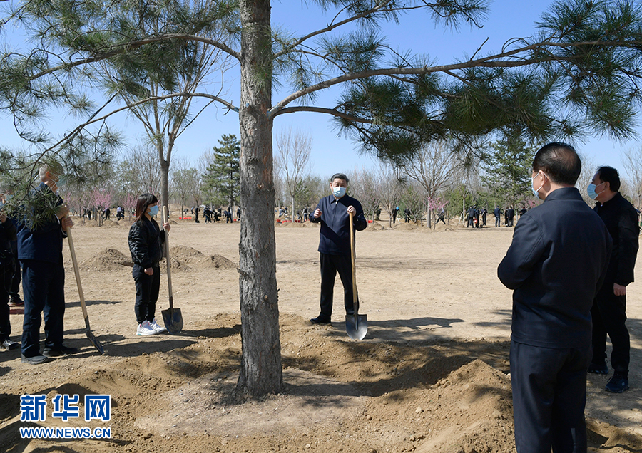 揮鍬鏟土、培土圍堰、提水澆灌……習近平接連種下油松、國槐、杏梅、元寶楓、西府海棠、金銀木、紅瑞木。在和煦的春風中,挺拔的樹苗錯落有致,鮮艷的花朵迎風招展,初綻的枝葉格外清新。植樹現場一片繁忙景象。參加勞動的領導同志同大家一起培土澆水,氣氛熱烈。