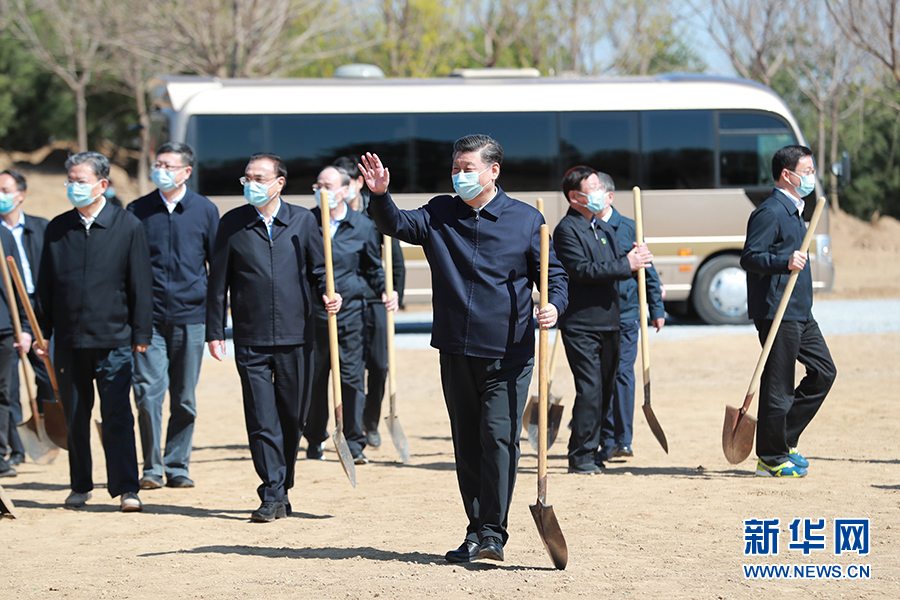 4月3日,黨和國家領導人習近平、李克強、栗戰書、汪洋、王滬寧、趙樂際、韓正、王岐山等來到北京市大興區舊宮鎮參加首都義務植樹活動。這是習近平拿起鐵鍬走向植樹地點,向正在植樹的干部群眾揮手致意。 新華社記者 龐興雷 攝