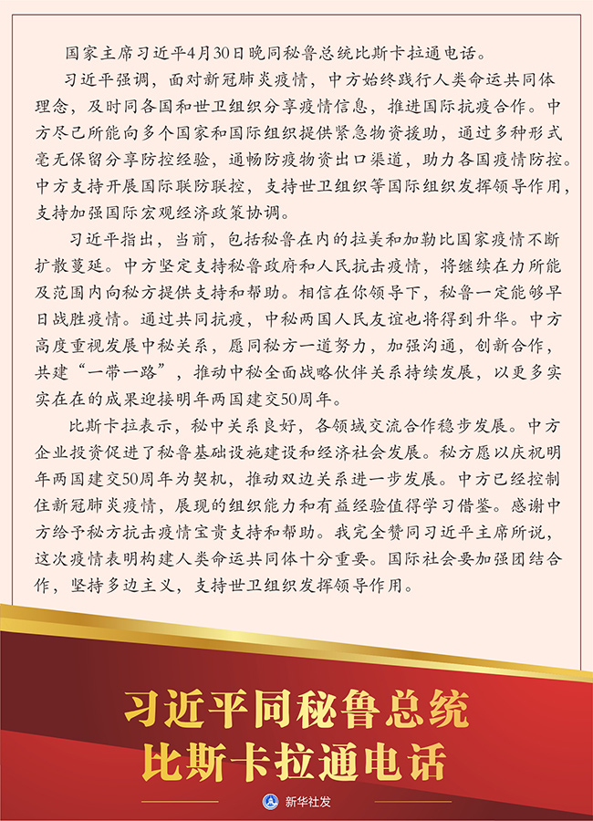 習(xí)近平指出,當(dāng)前,包括秘魯在內(nèi)的拉美和加勒比國家疫情不斷擴(kuò)散蔓延。中方堅定支持秘魯政府和人民抗擊疫情,將繼續(xù)在力所能及范圍內(nèi)向秘方提供支持和幫助。相信在你領(lǐng)導(dǎo)下,秘魯一定能夠早日戰(zhàn)勝疫情。通過共同抗疫,中秘兩國人民友誼也將得到升華。中方高度重視發(fā)展中秘關(guān)系,愿同秘方一道努力,加強(qiáng)溝通,創(chuàng)新合作,共建“一帶一路”,推動中秘全面戰(zhàn)略伙伴關(guān)系持續(xù)發(fā)展,以更多實實在在的成果迎接明年兩國建交50周年。