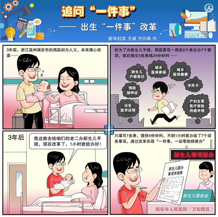 從6個部門的5張表格、24份材料,到群眾生活中的“一件事、一站零跑順便辦”,2019年7月,瑞安出生“一件事”改革經驗開始在浙江全省推廣。