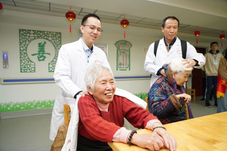 三明市盲協(xié)主席江華帶領(lǐng)盲人志愿團(tuán)隊為社區(qū)老人按摩推拿。周志鴻 攝
