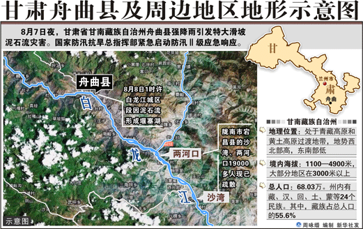 舟曲縣位于甘肅南部,甘南藏族自治州東南部,東鄰武都縣,北接宕昌縣,西南與迭部縣、文縣和四川省九寨溝縣接壤。全縣總面積3010平方公里,轄20個鄉、2個鎮,210個行政村,總人口13.47萬人,其中藏族4.4萬人,占32.78%。