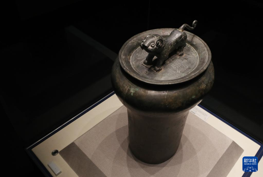3月14日拍摄的在展览中展出的战国青铜虎钮錞于。