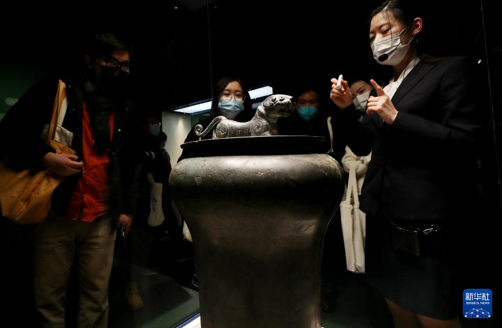 3月14日,参观者在战国青铜虎钮錞于展柜前听讲解员介绍展品细节。