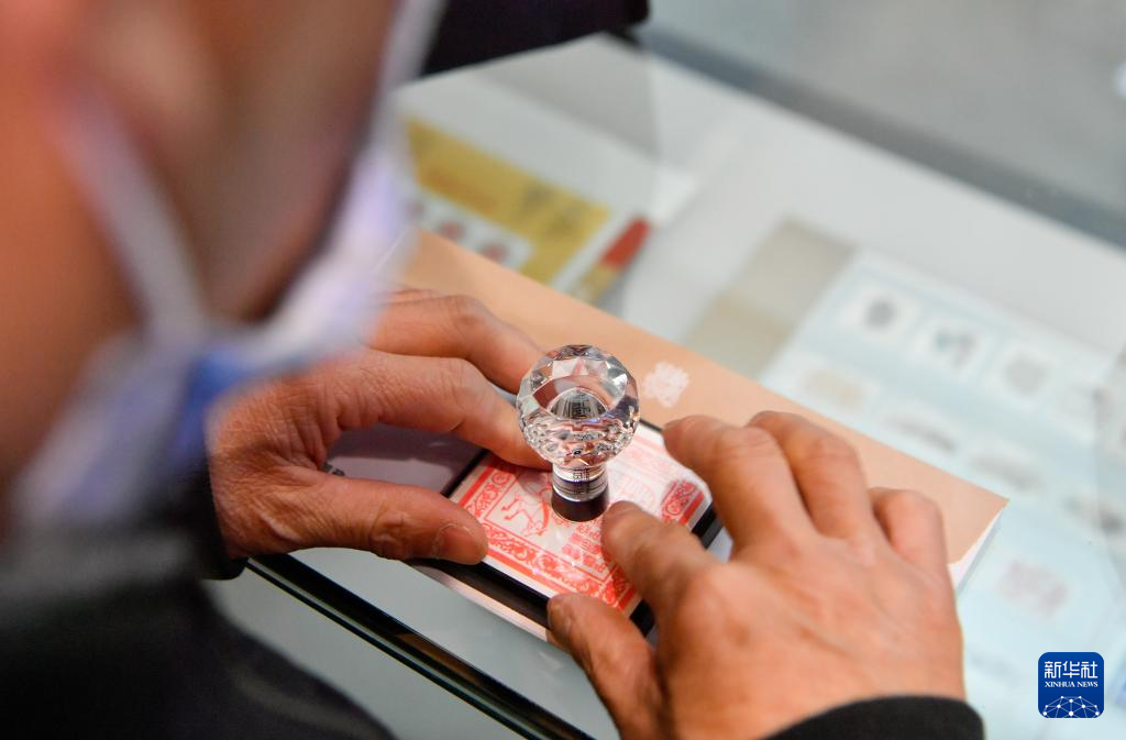 3月23日,在天津邮政博物馆,工作人员为集邮爱好者购买的纪念封印邮资。