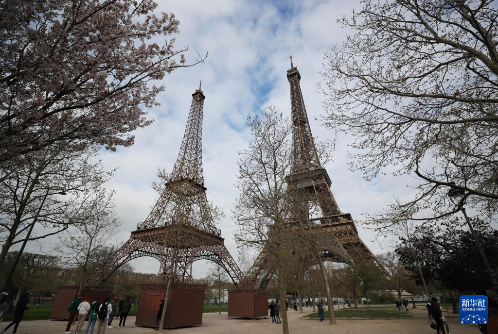 这是4月3日在法国巴黎拍摄的埃菲尔铁塔(后)和“小埃菲尔铁塔”。