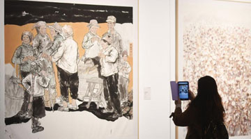 4月15日,受邀嘉宾在“2023第六届苏州·金鸡湖双年展”上参观、讨论艺术作品。