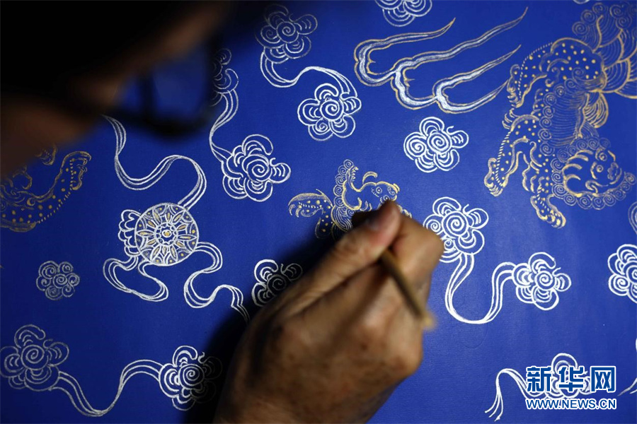 近日,宫廷描金纸省级非遗传承人范发生在进行描金纸画稿拷贝。