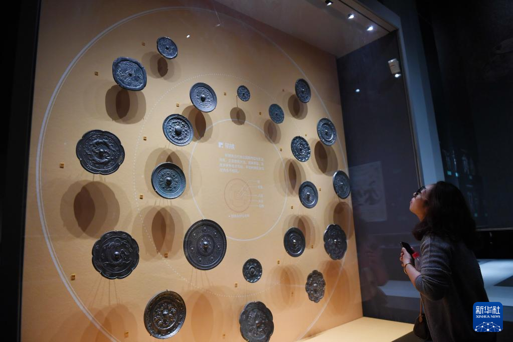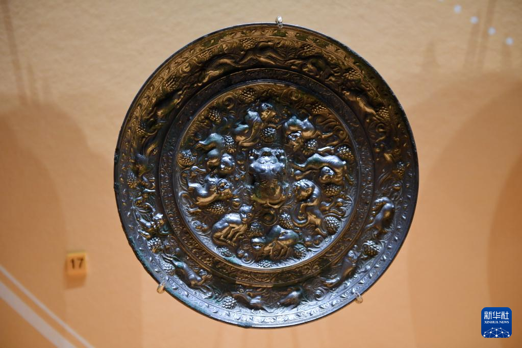 这是在西安博物院展出的唐代瑞兽葡萄纹铜镜(5月8日摄)。葡萄、苜蓿等农作物通过丝绸之路传入中国。