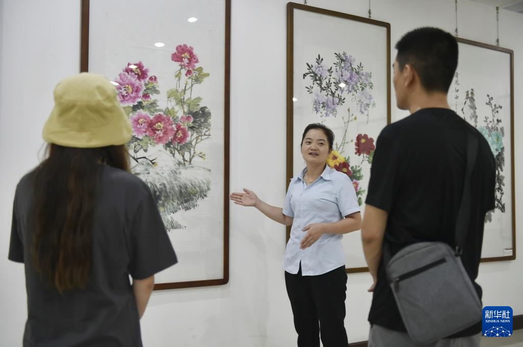 7月26日,工作人员在平乐社区的牡丹画创意产业园区展厅内向来访者介绍牡丹画。