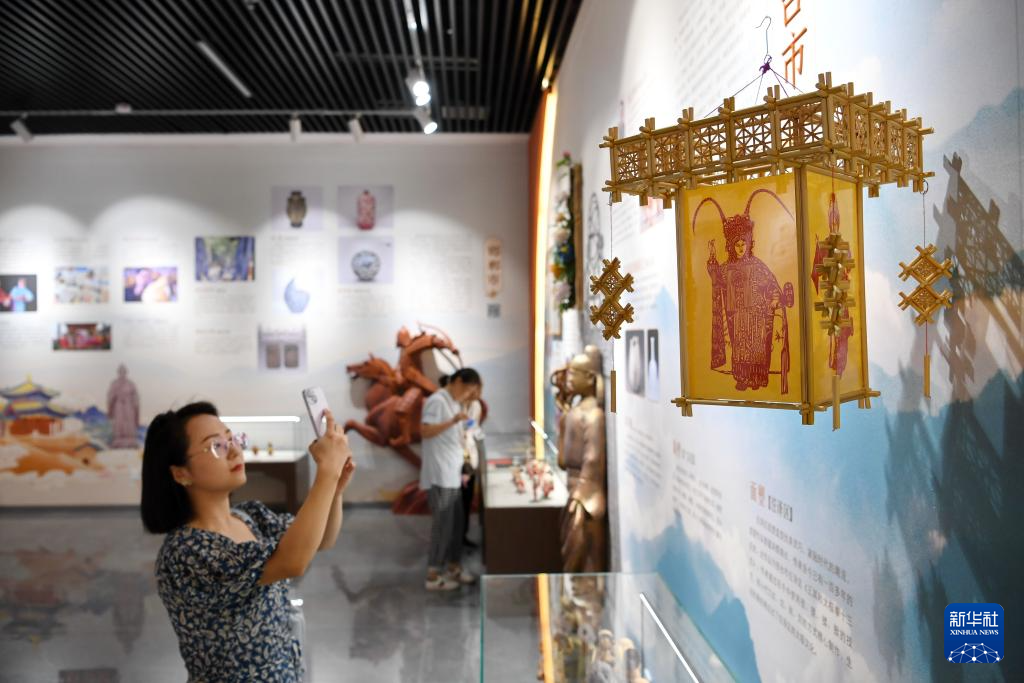 7月28日,参观者在“燕赵神韵——河北省民间文艺精品展”上拍照。