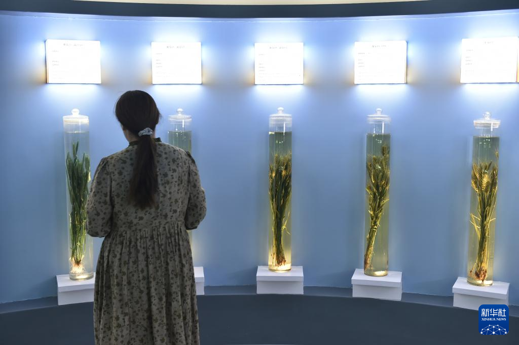 9月16日,讲解员(右二)在温县小麦博物馆为观众介绍展品。