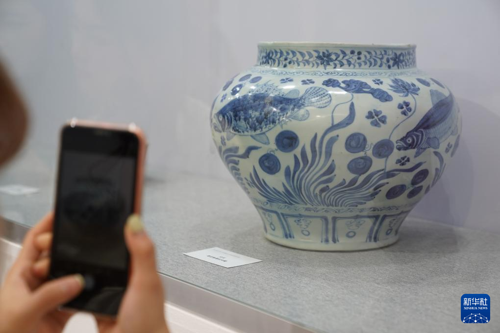 10月18日,参观者在瓷博会现场举办的第六届世界华人收藏家大会瓷器精品展上拍摄展品。
