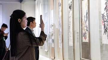 11月11日,参展艺术家(左一)在叶氏宗祠向观众介绍作品。