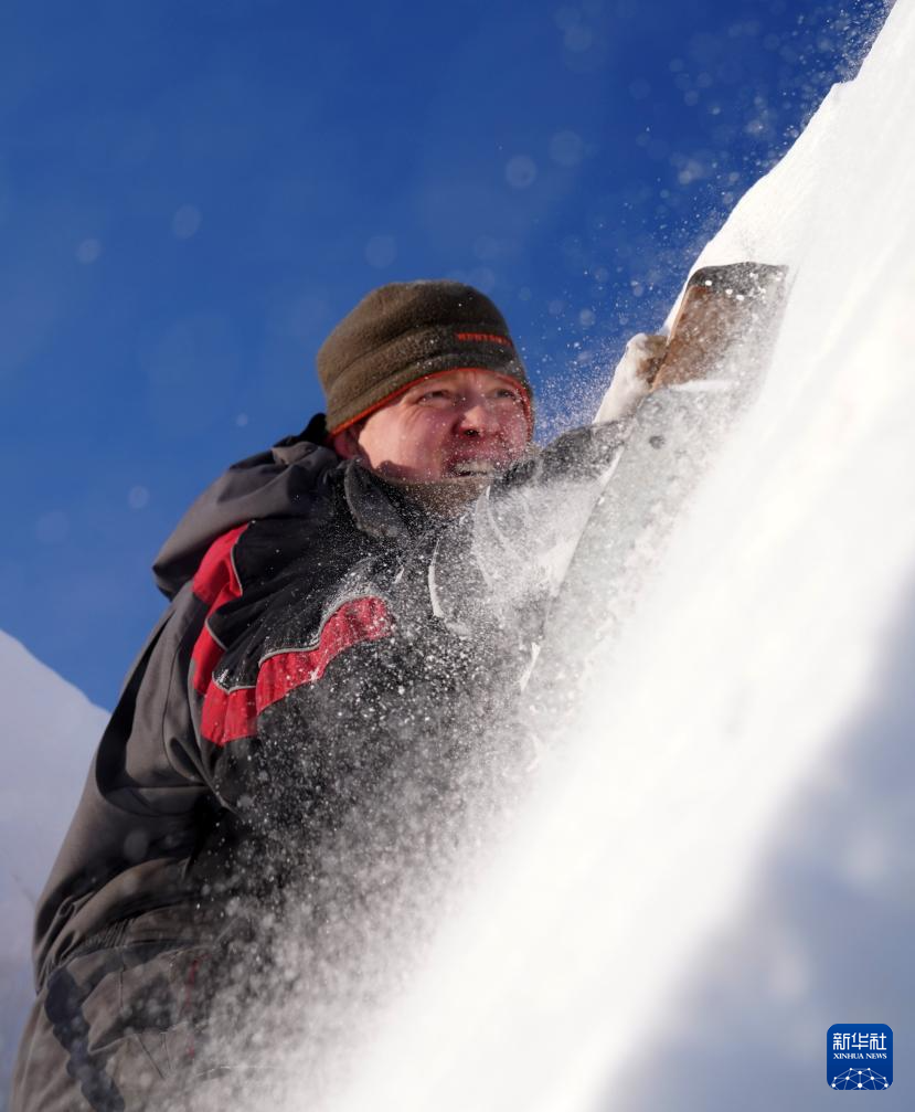 1月7日,选手在哈尔滨太阳岛雪博会园区进行雪雕创作。