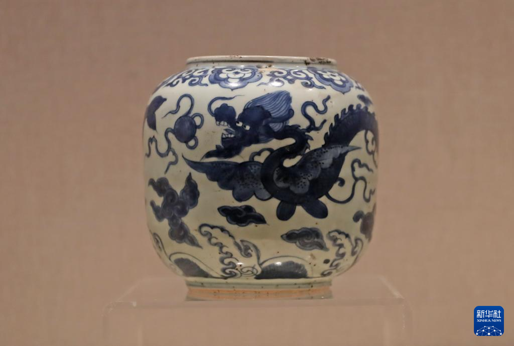 2月2日在辽宁省博物馆拍摄的青花飞龙纹罐。