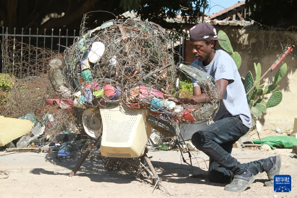这是7月3日在位于津巴布韦哈拉雷省的一座小镇拍摄的约翰逊·祖泽制作的艺术品。