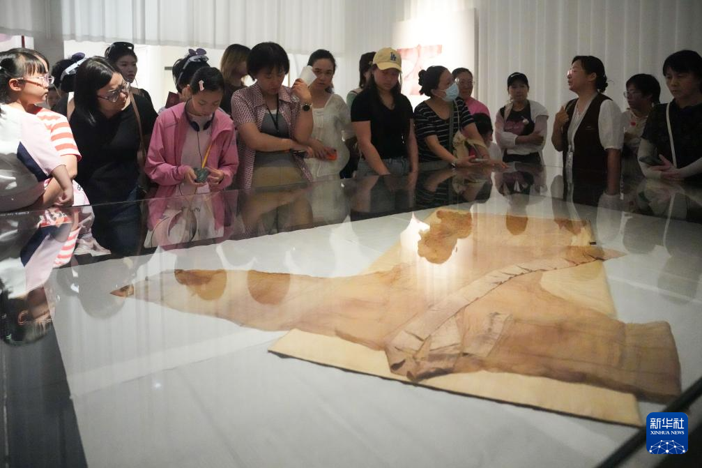 7月16日,观众在湖南博物院“彼美人兮——两汉罗马时期女性文物展”上观赏出土于马王堆汉墓的我国国宝级文物曲裾素纱单衣。