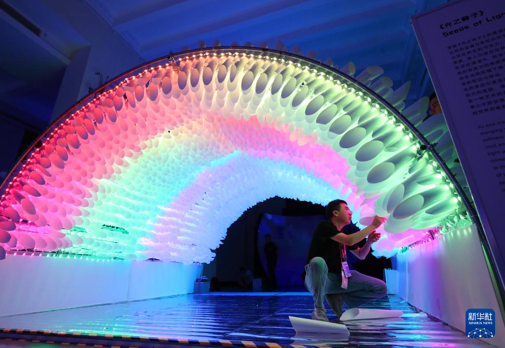 9月18日,工作人员安装调试灯光装饰艺术作品。